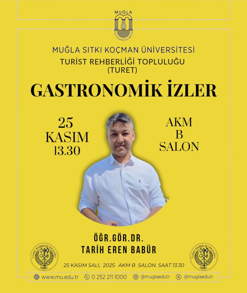 Muğla Sıtkı Koçman Üniversitesi Turist Rehberliği Topluluğu (TURET) tarafından davet edilen bölümümüz öğretim elemanı Öğr. Gör. Dr.Tarih Eren BABÜR 25.11.2025 Salı Günü Muğla Merkez Yerleşkede bulunan Atatürk Kültür Merkezi'nde olacaktır. Etkinlik kapsamında Gastronomi tarihi, gündelik hayatımızın içinde olan ancak tarihi kökenlerini duyduğumuzda bizde şaşkınlık uyandıran konular üzerine yapılacak konuşmada, Muğla Turizm Fakültesi öğrencileri ve siz bölüm öğrencilerimizi de salonda görmekten mutluluk duyarız.